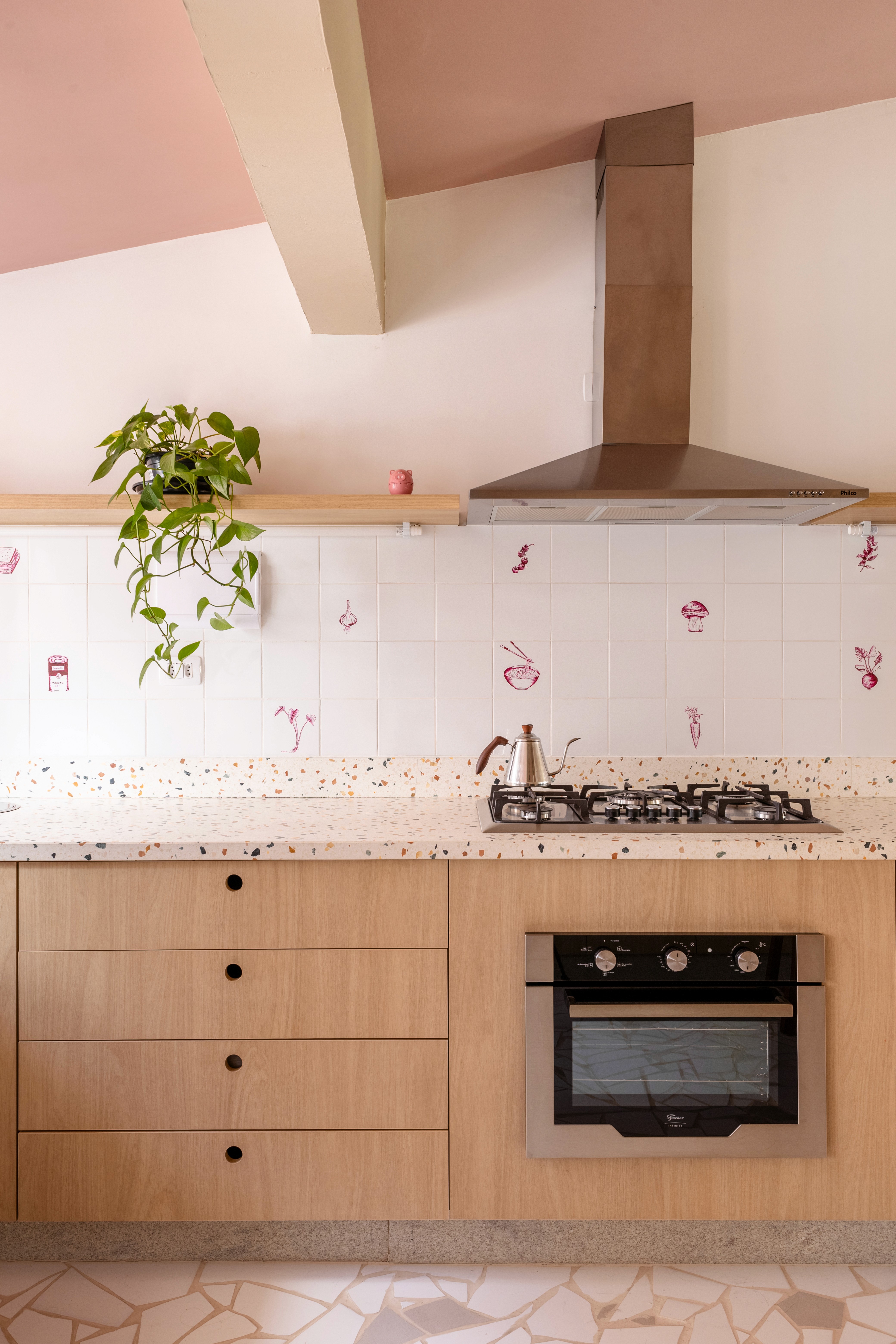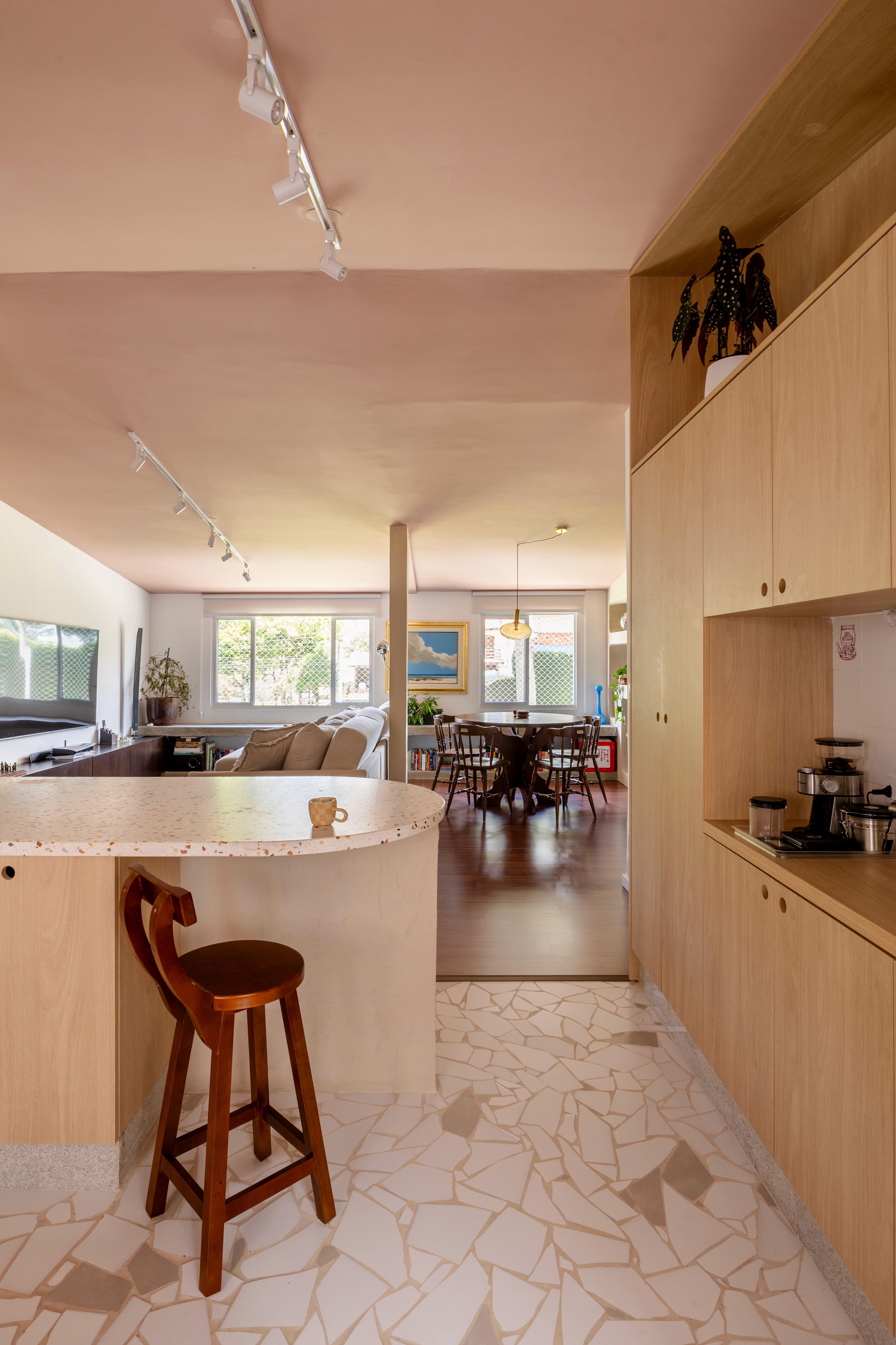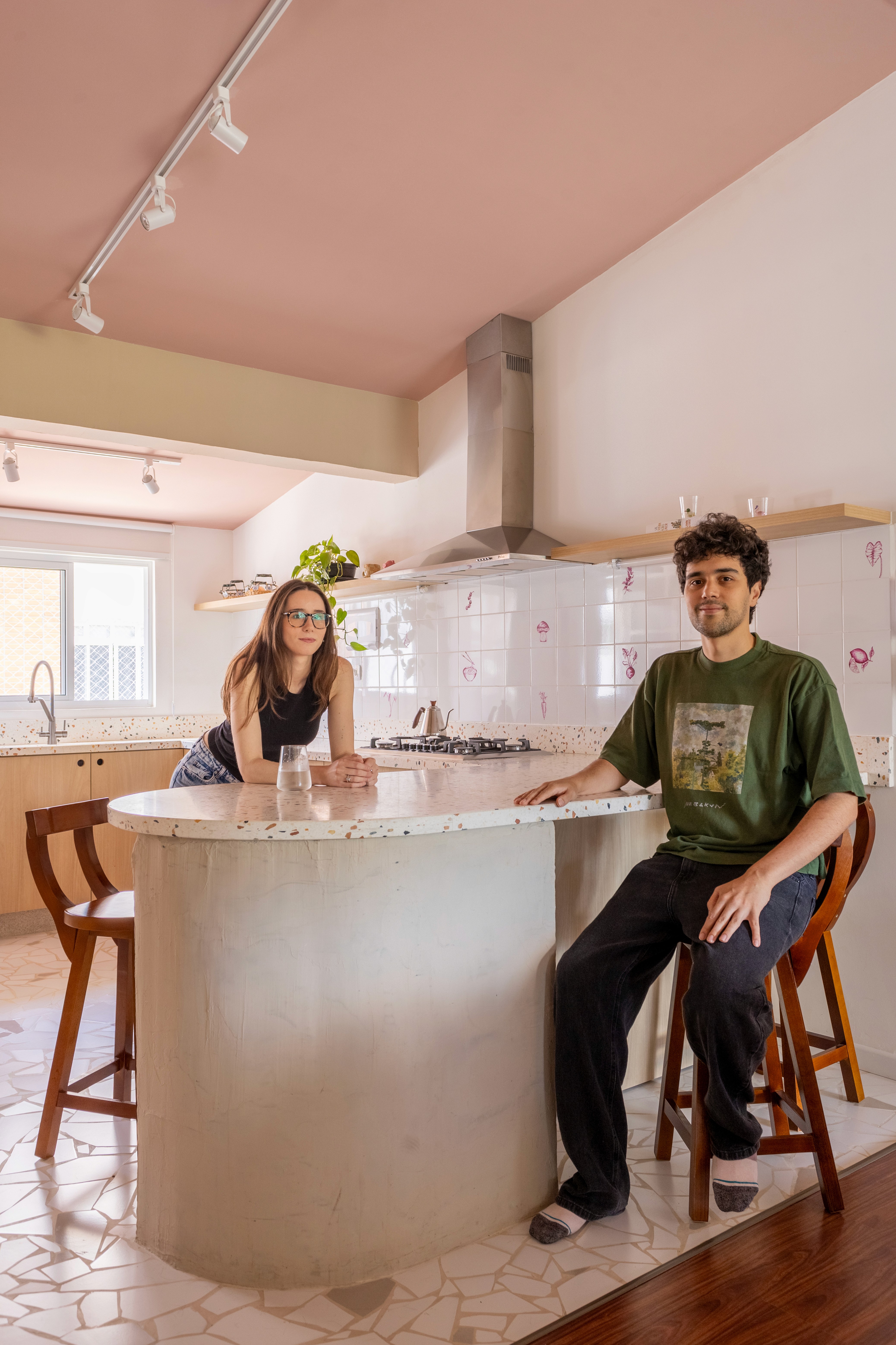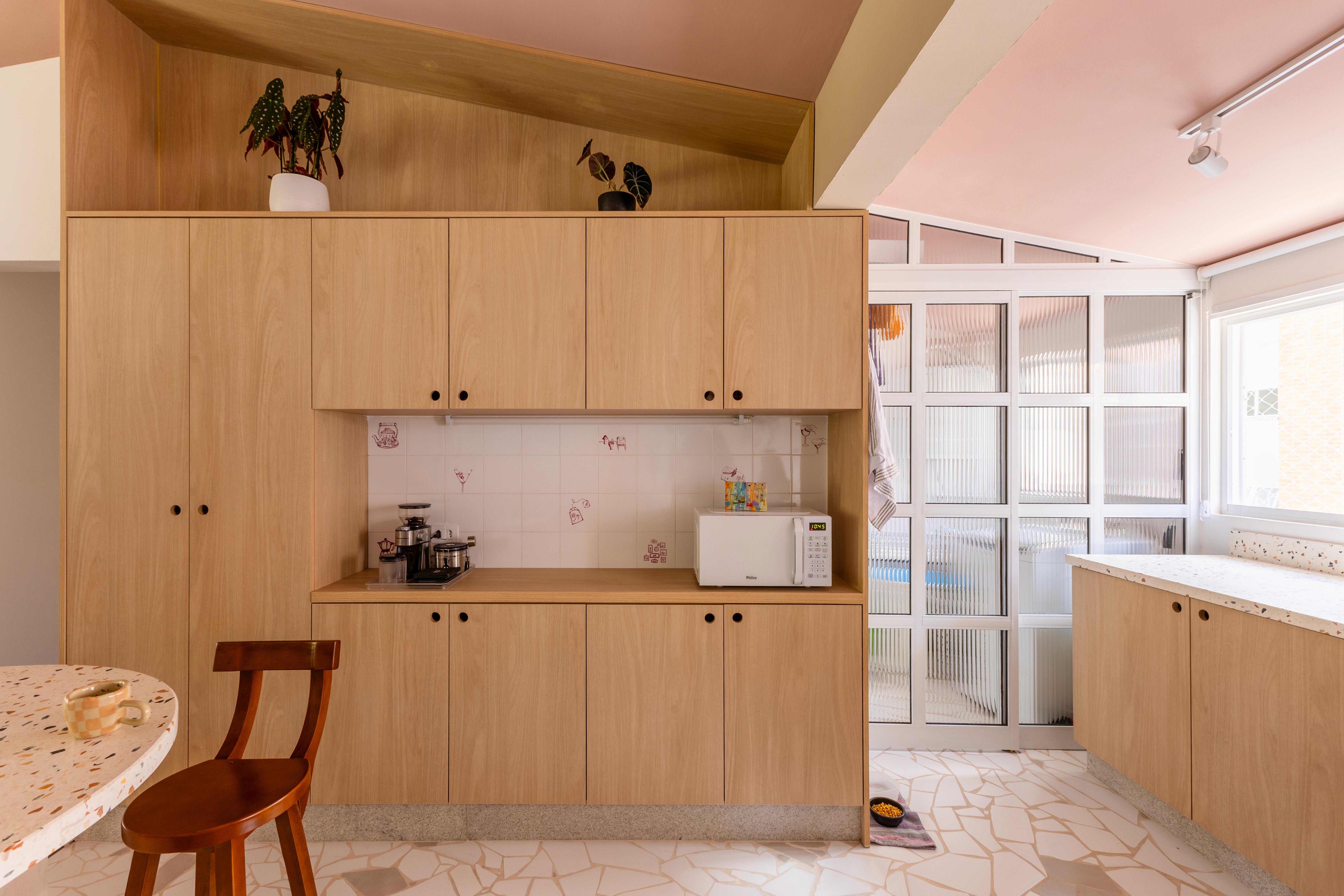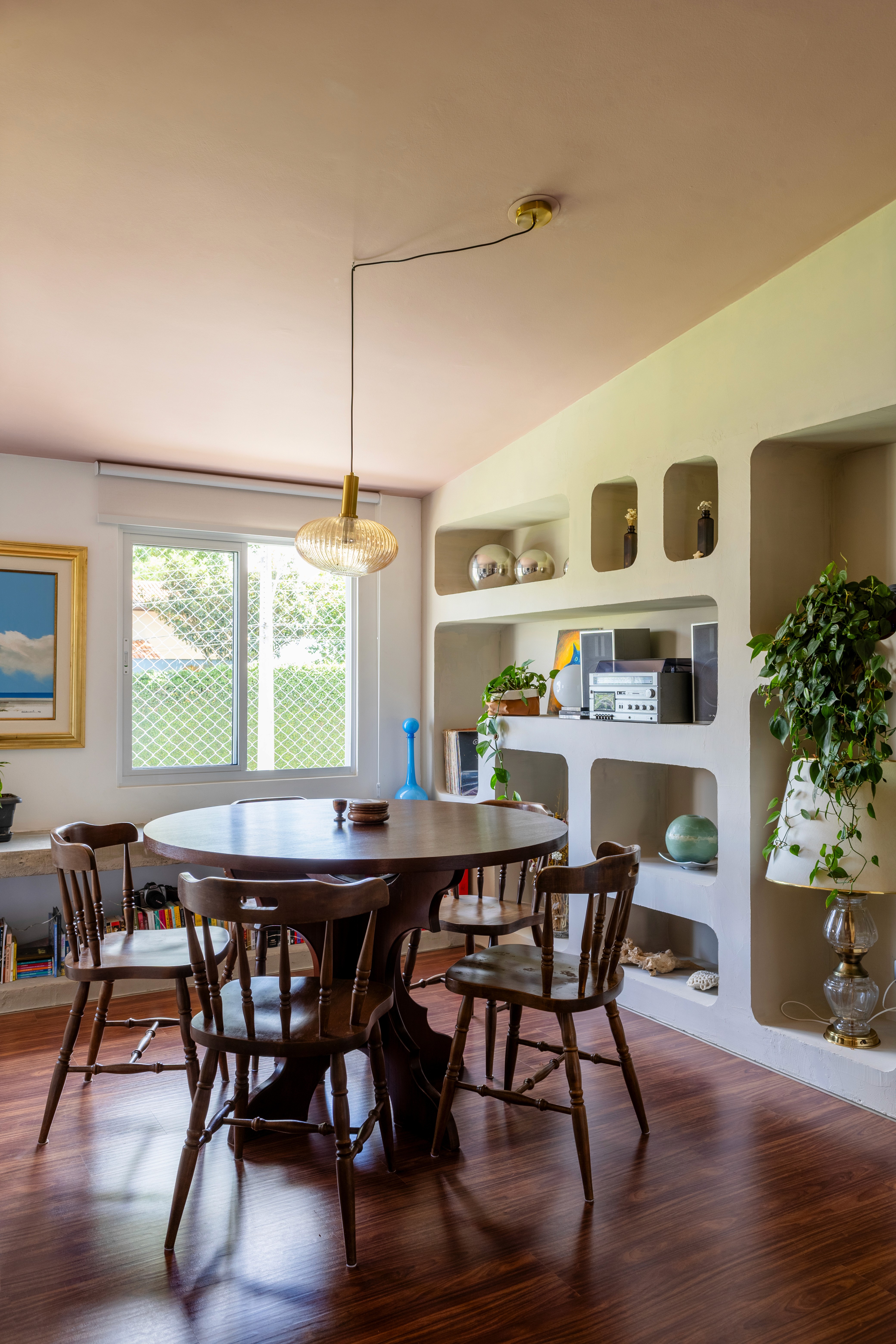 O design de interiores abraça quem entra logo no primeiro olhar. O teto inclinado, uma raridade que a fez se apaixonar pelo imóvel, foi assumido e valorizado. Logo abaixo, uma imponente parede de nichos orgânicos na sala de estar abriga as memórias e a personalidade marcante da moradora. Na cozinha, o revestimento do piso em cacos cerâmicos resgata uma nostalgia elegante com muito cuidado nas texturas, enquanto o toque de exclusividade fica por conta dos azulejos do frontão, ilustrados à mão pela irmã da cliente.