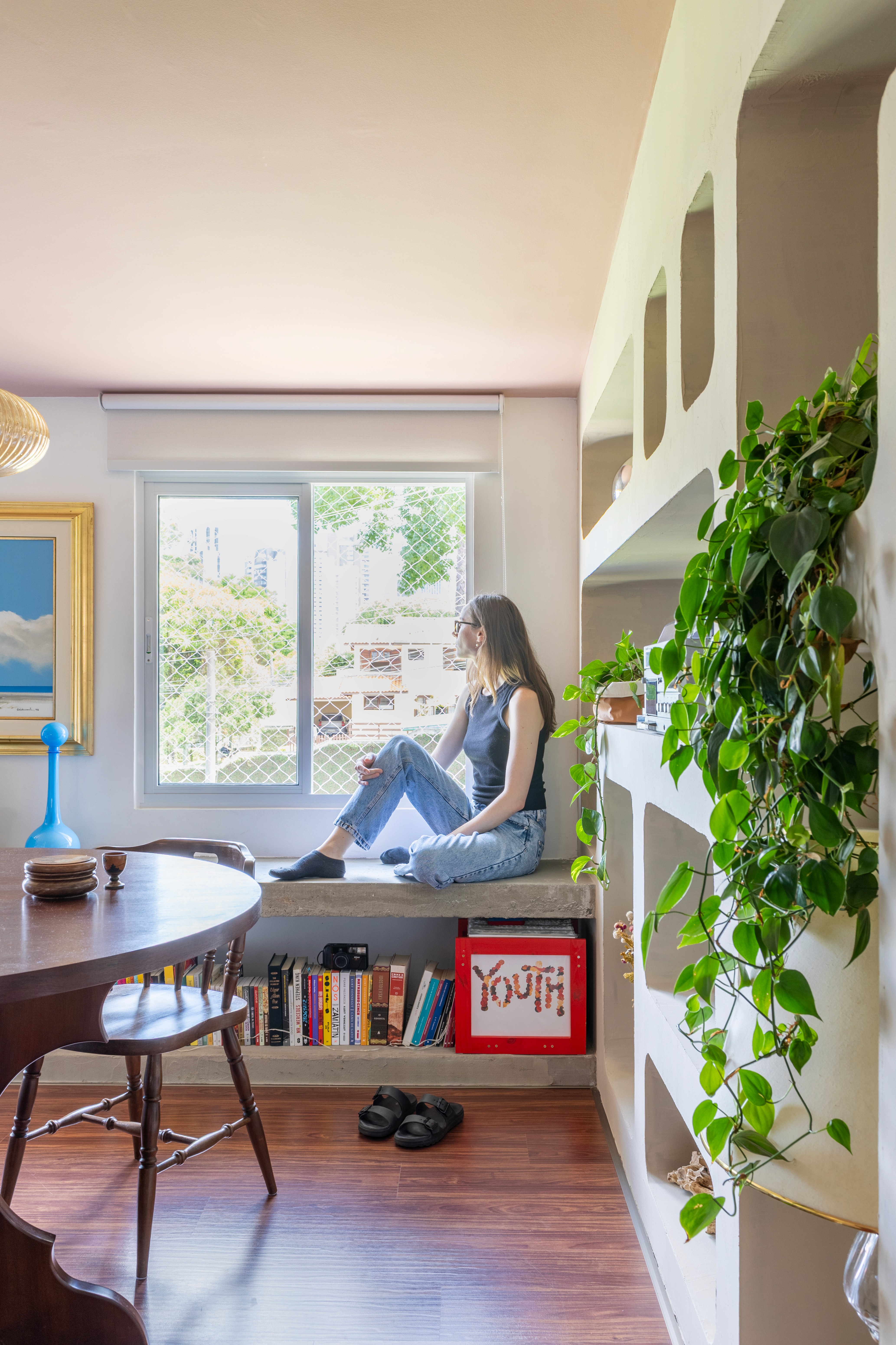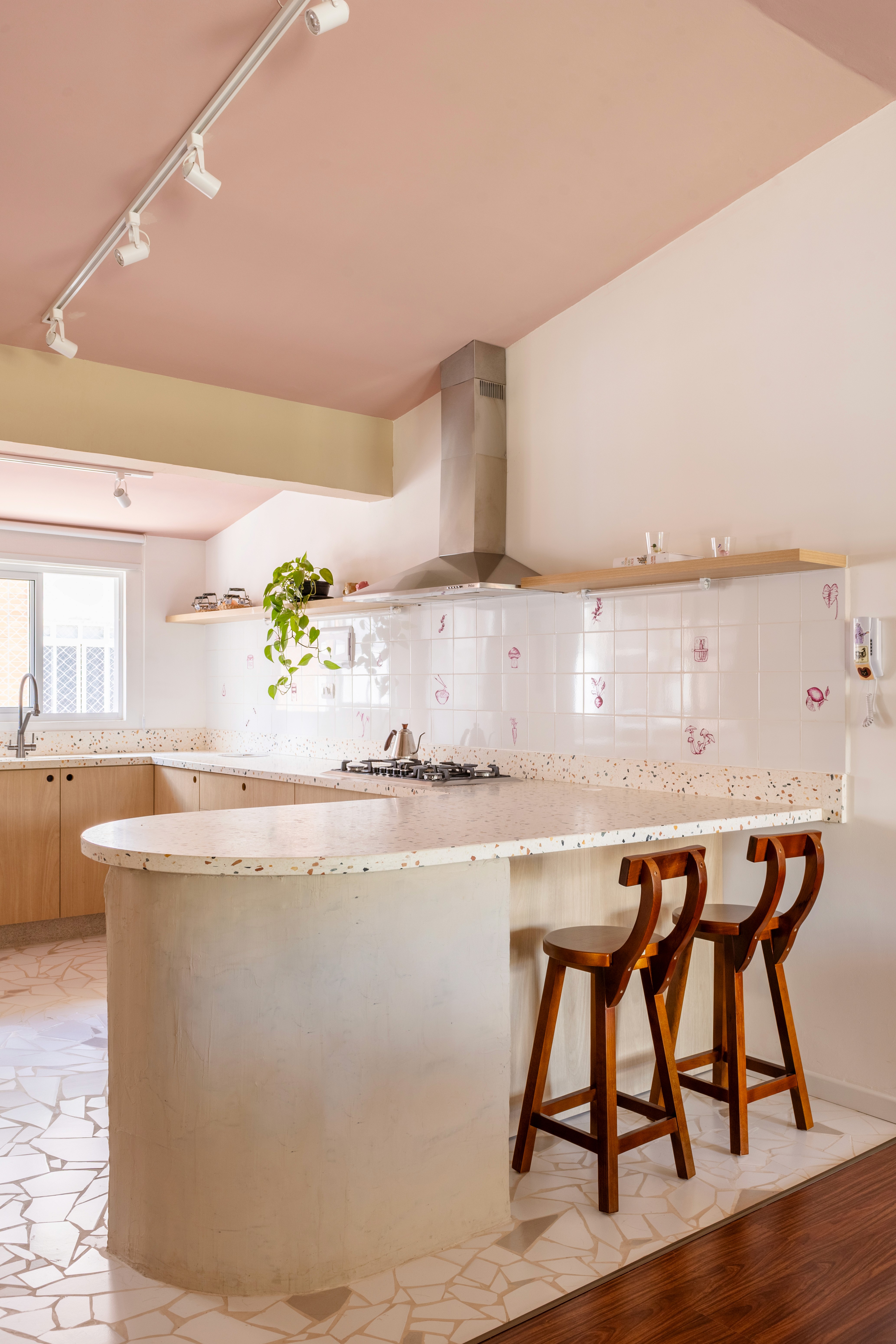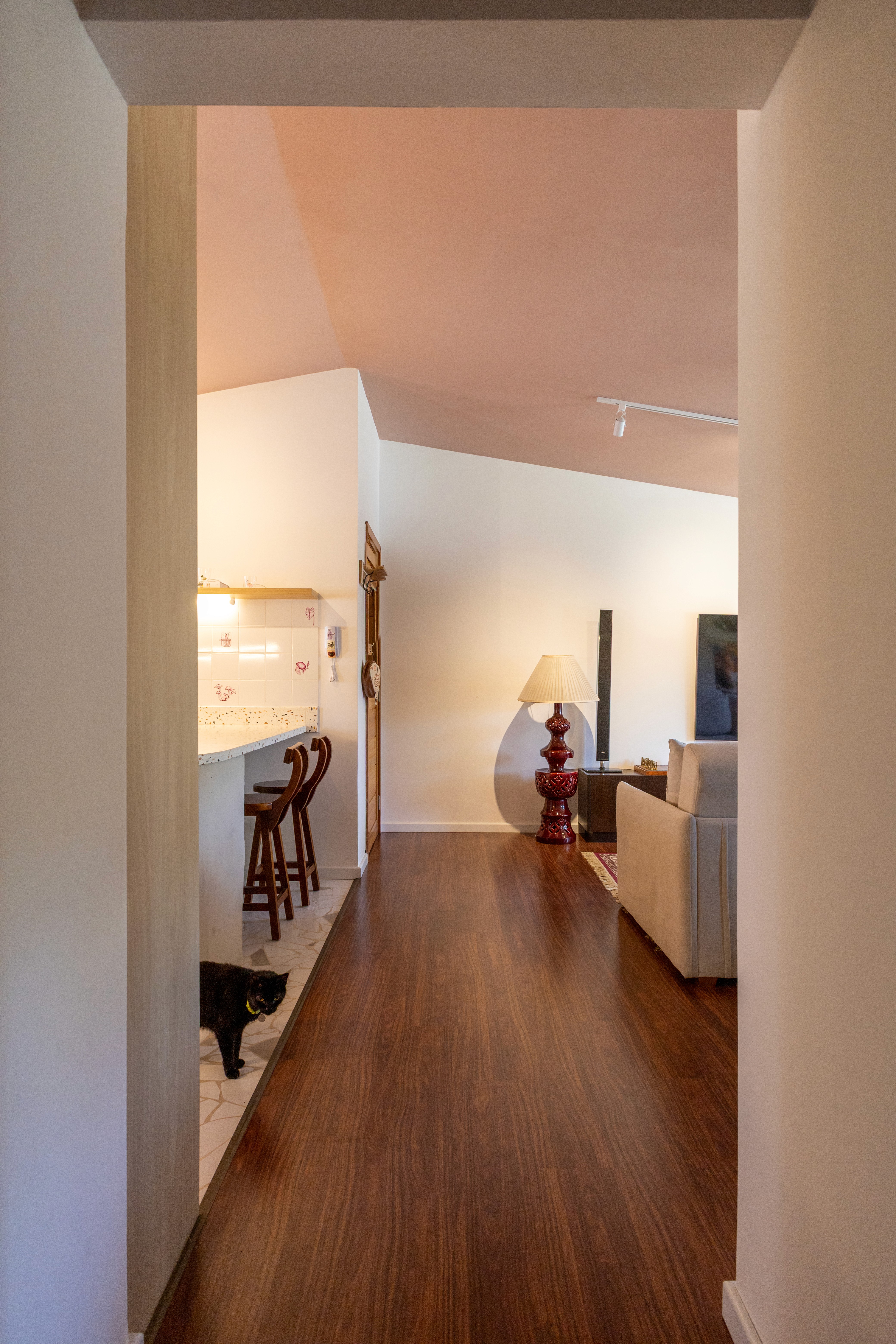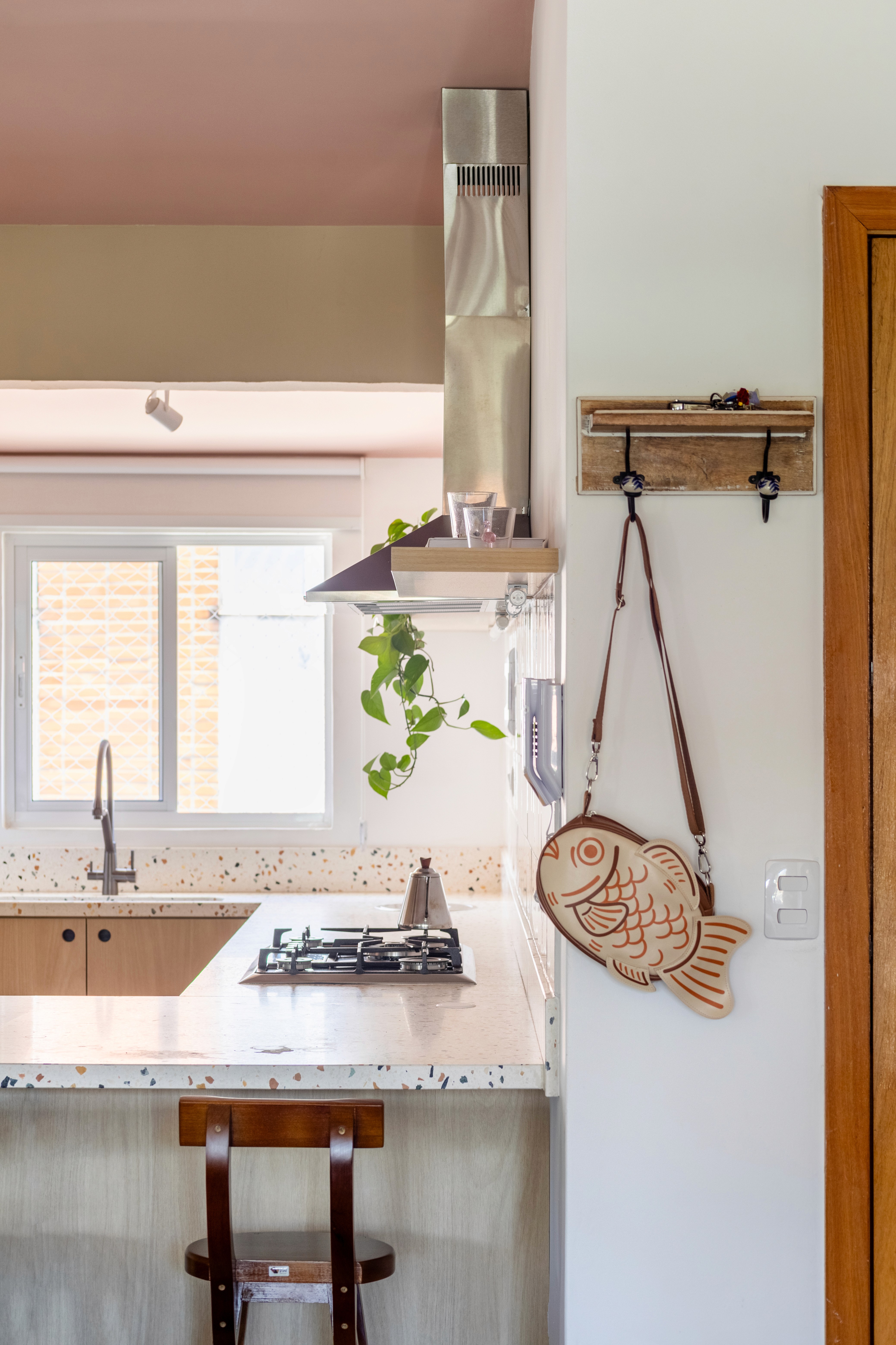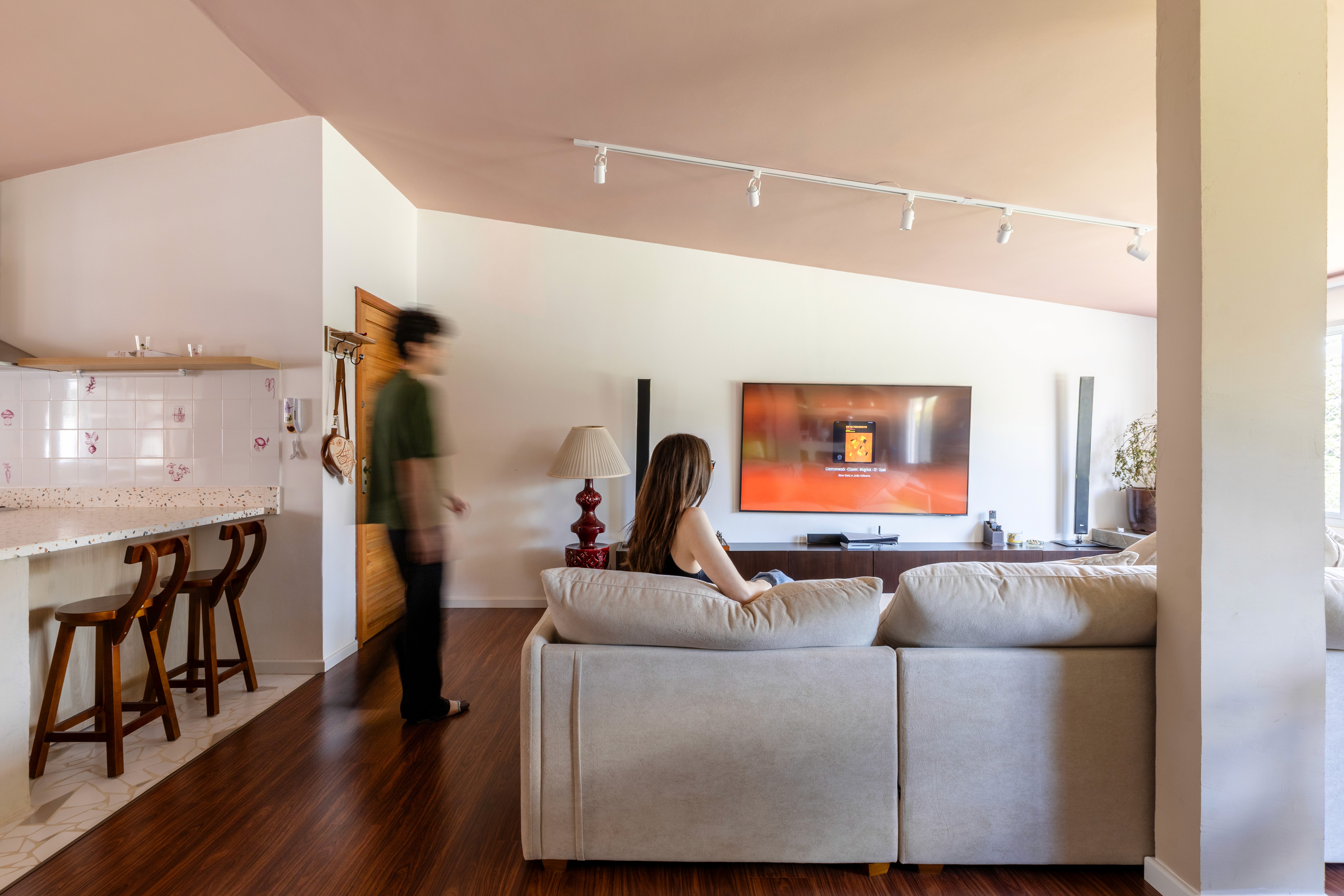 O design de interiores abraça quem entra logo no primeiro olhar. O teto inclinado, uma raridade que a fez se apaixonar pelo imóvel, foi assumido e valorizado. Logo abaixo, uma imponente parede de nichos orgânicos na sala de estar abriga as memórias e a personalidade marcante da moradora. Na cozinha, o revestimento do piso em cacos cerâmicos resgata uma nostalgia elegante com muito cuidado nas texturas, enquanto o toque de exclusividade fica por conta dos azulejos do frontão, ilustrados à mão pela irmã da cliente.