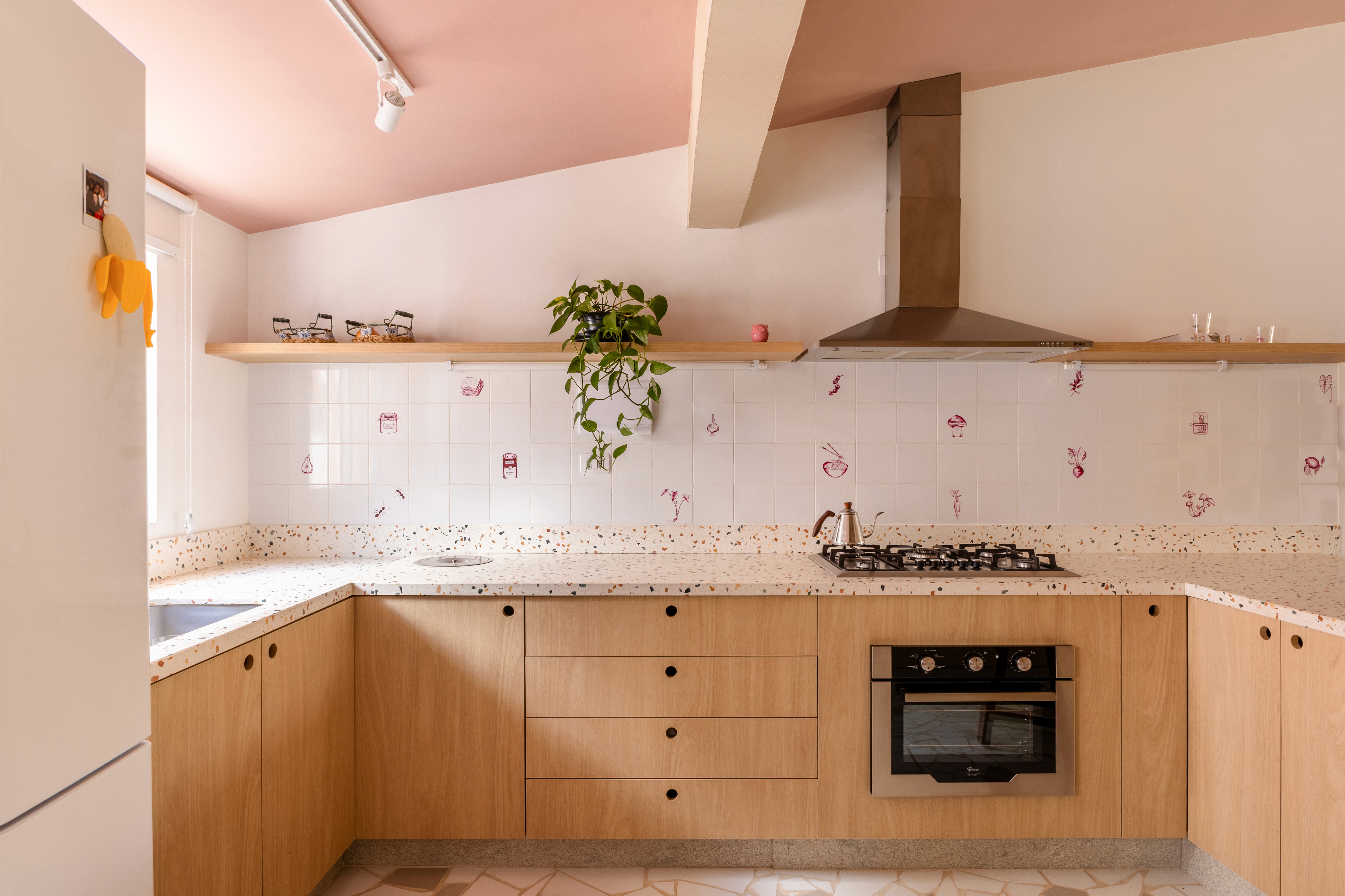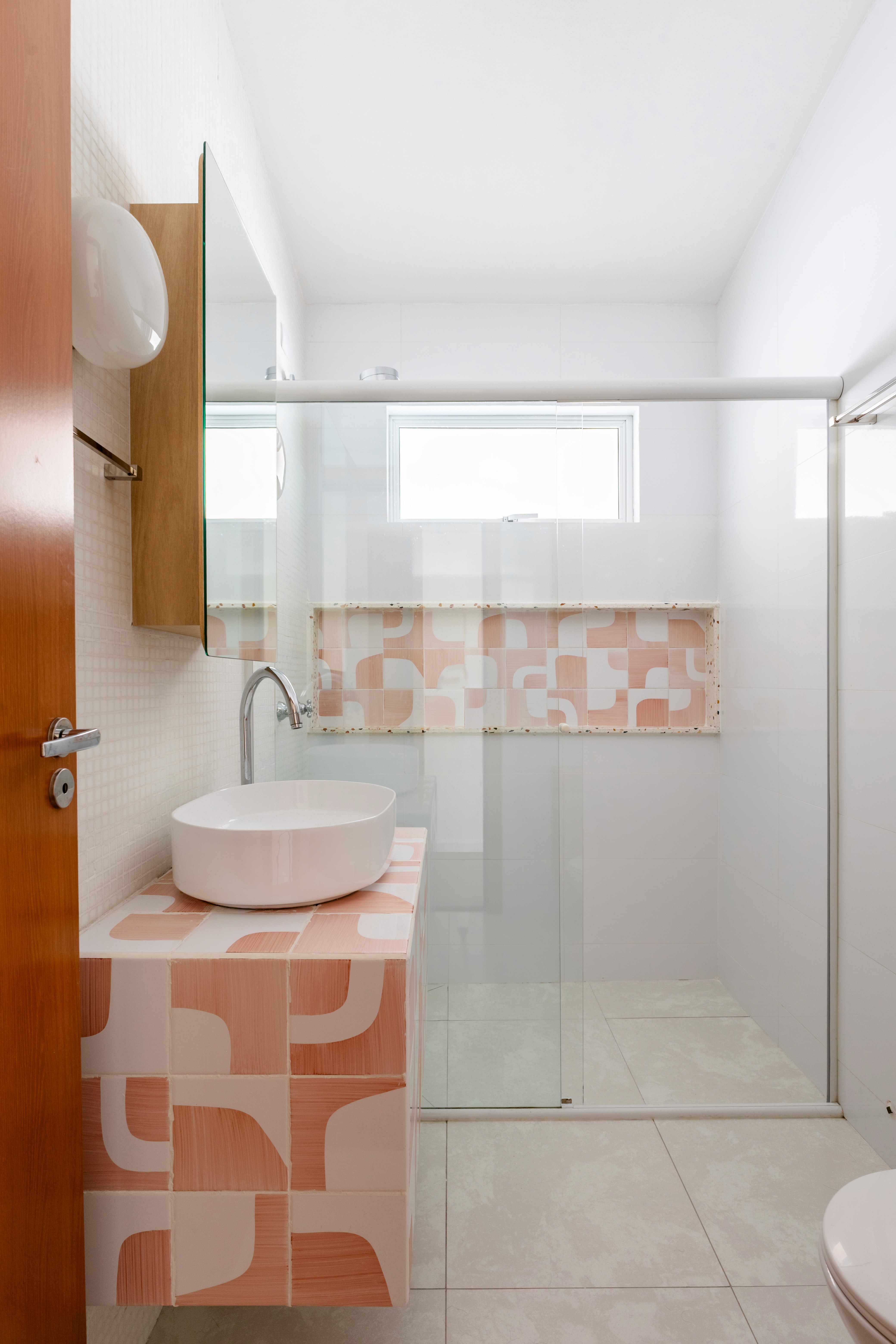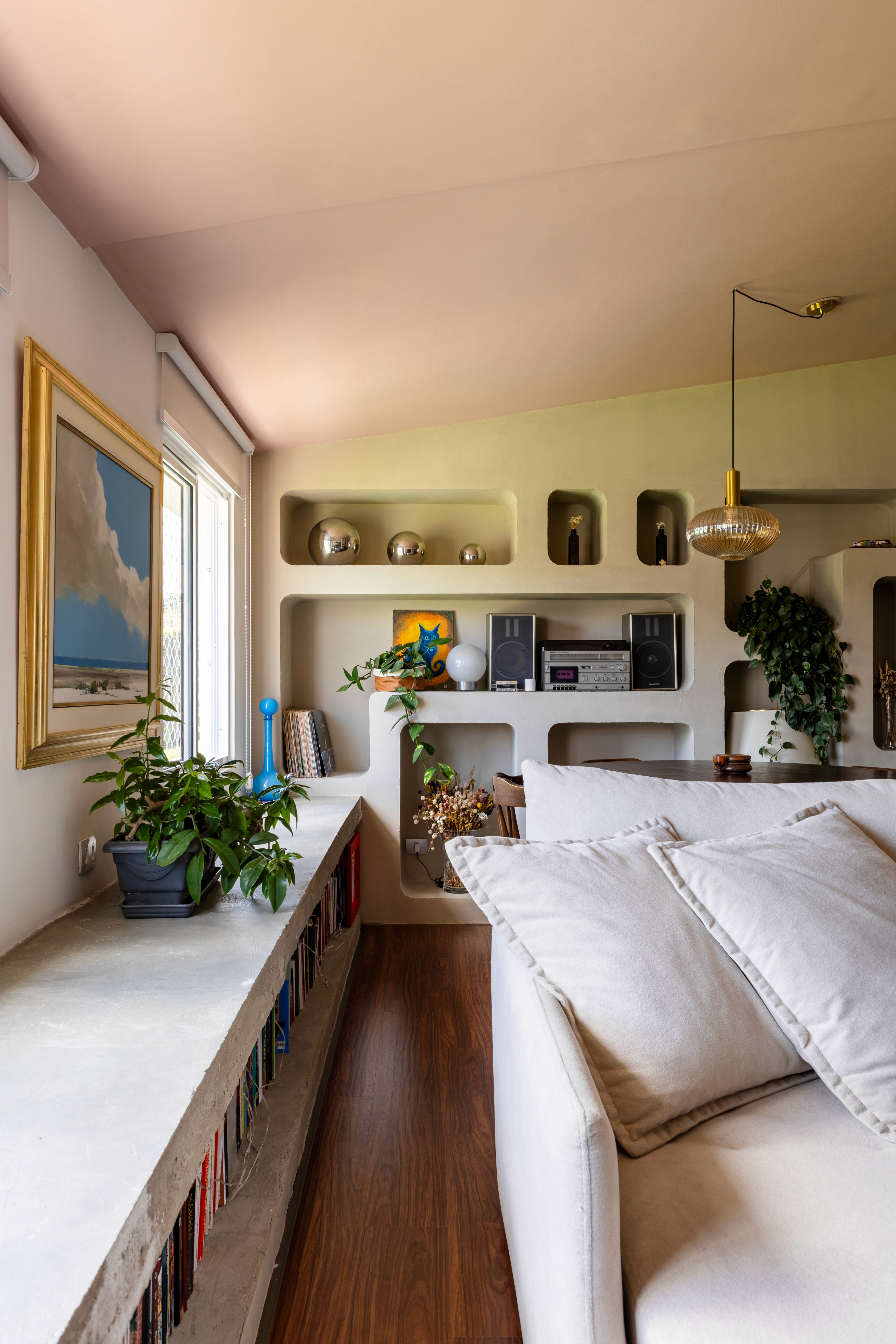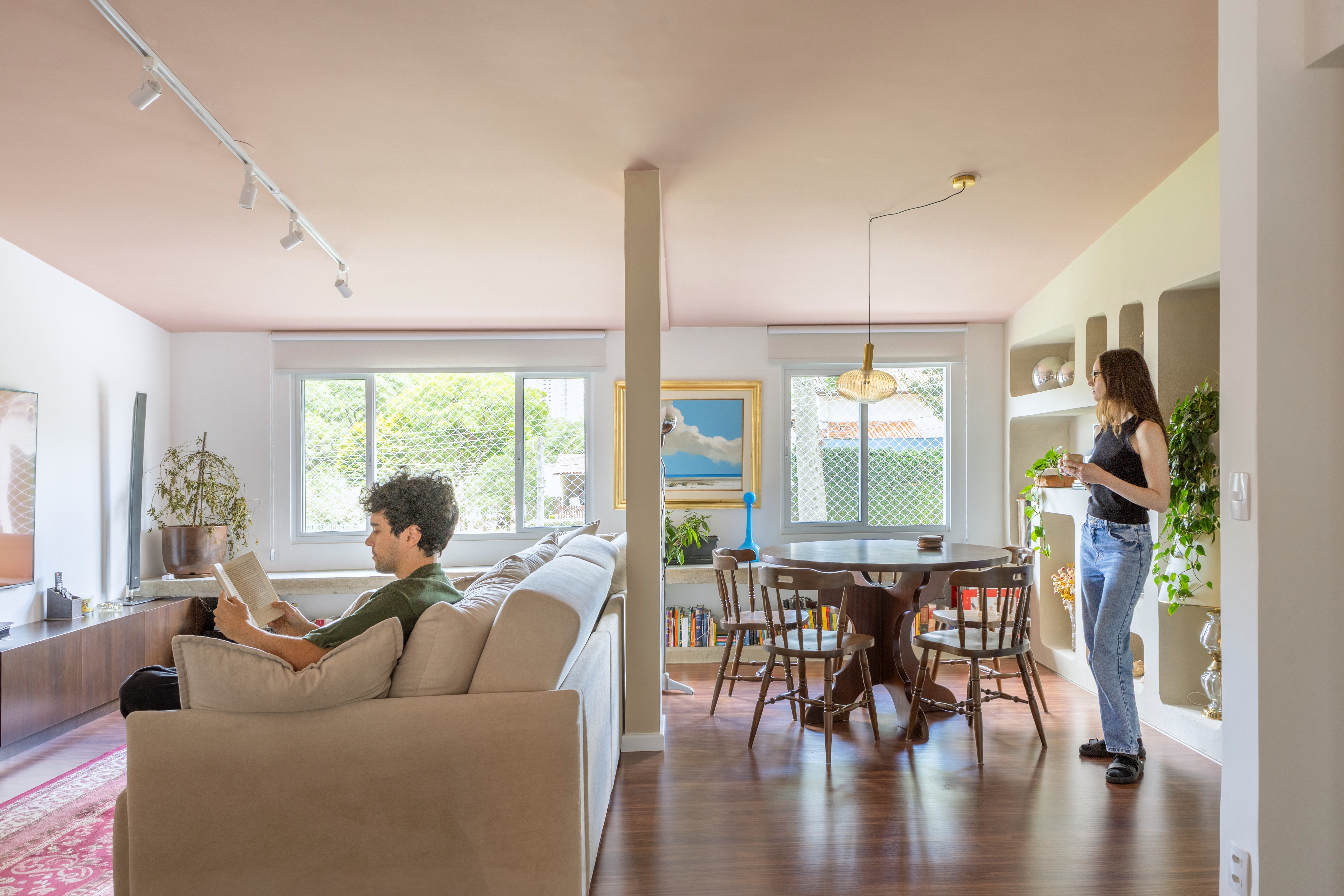 O design de interiores abraça quem entra logo no primeiro olhar. O teto inclinado, uma raridade que a fez se apaixonar pelo imóvel, foi assumido e valorizado. Logo abaixo, uma imponente parede de nichos orgânicos na sala de estar abriga as memórias e a personalidade marcante da moradora. Na cozinha, o revestimento do piso em cacos cerâmicos resgata uma nostalgia elegante com muito cuidado nas texturas, enquanto o toque de exclusividade fica por conta dos azulejos do frontão, ilustrados à mão pela irmã da cliente.