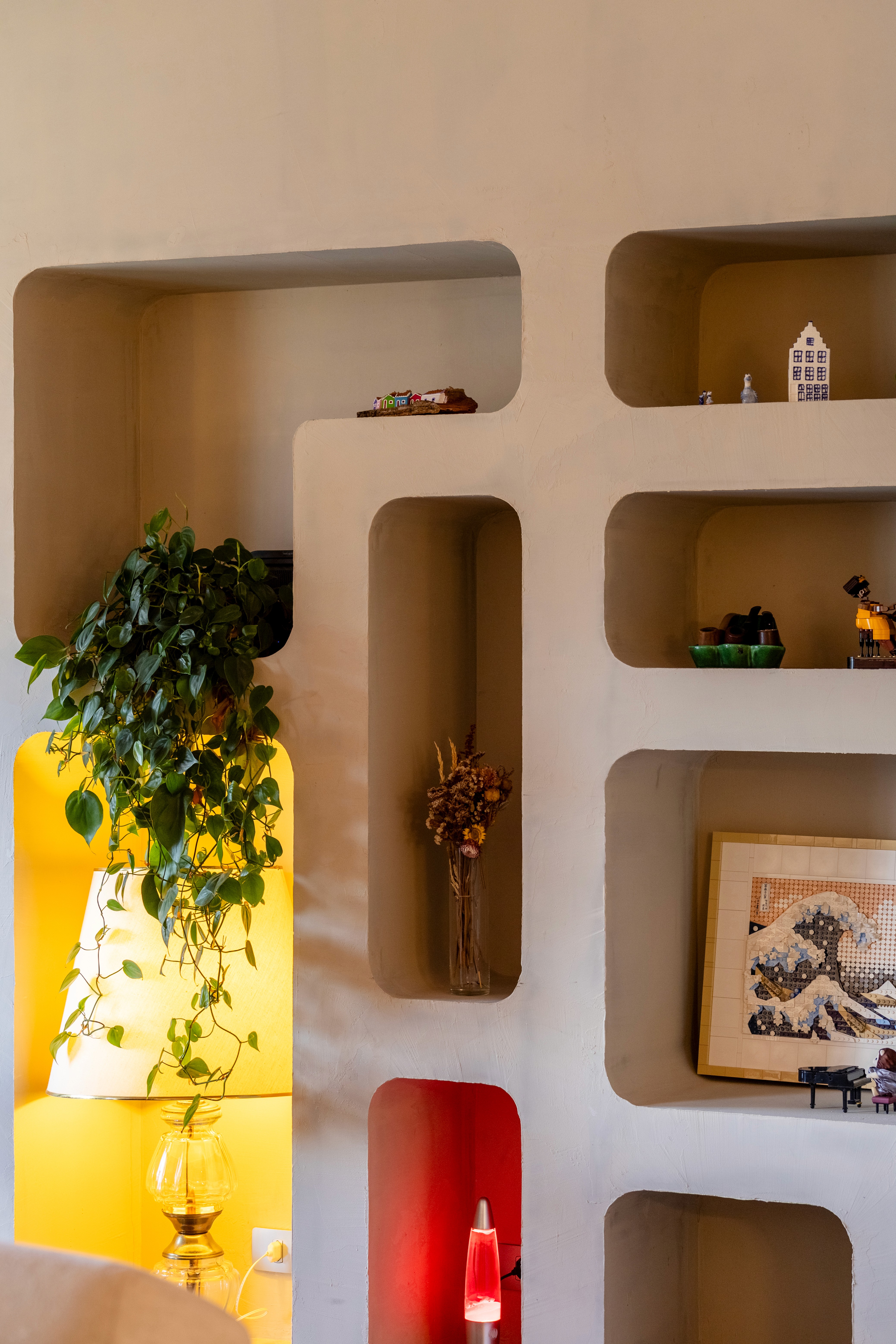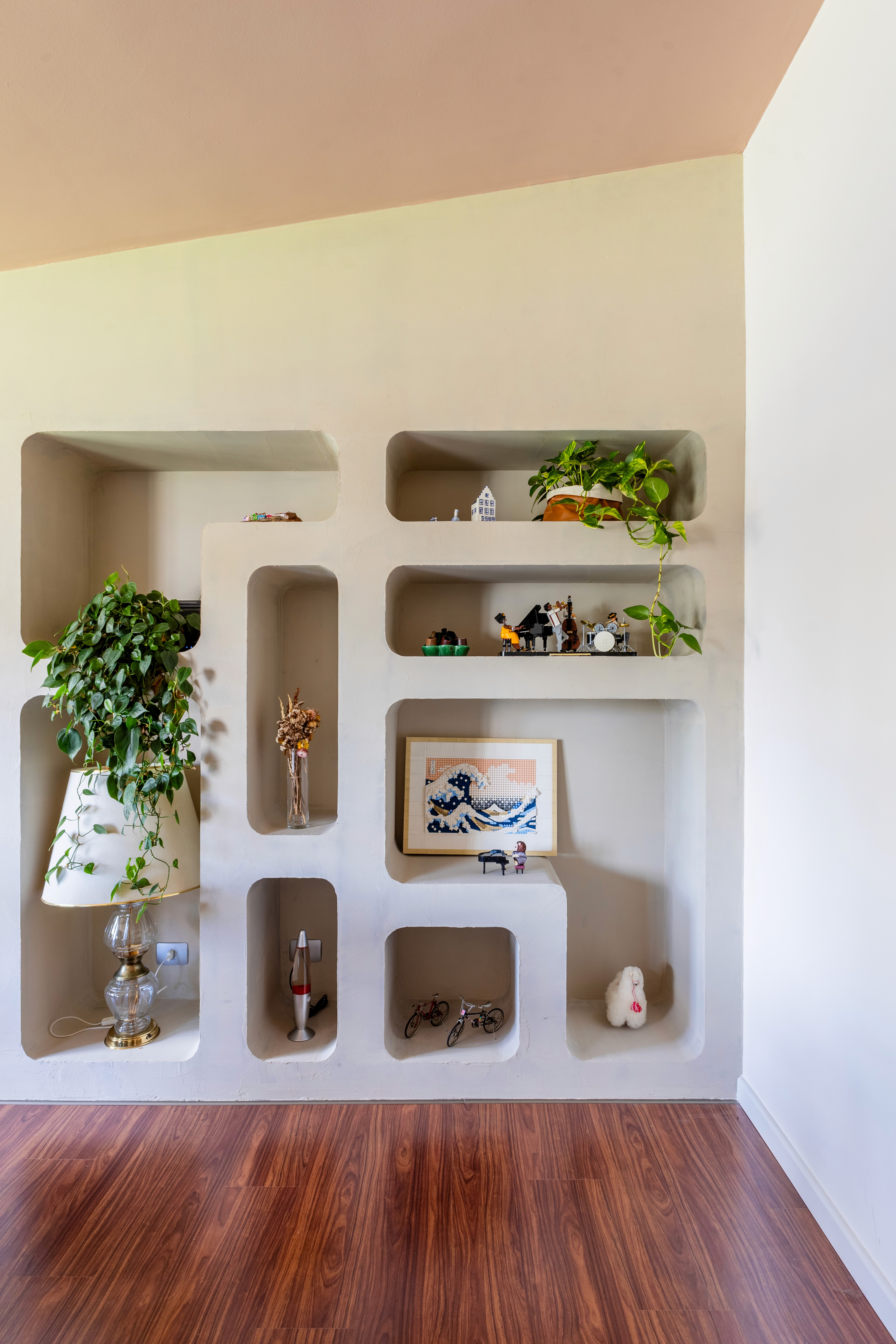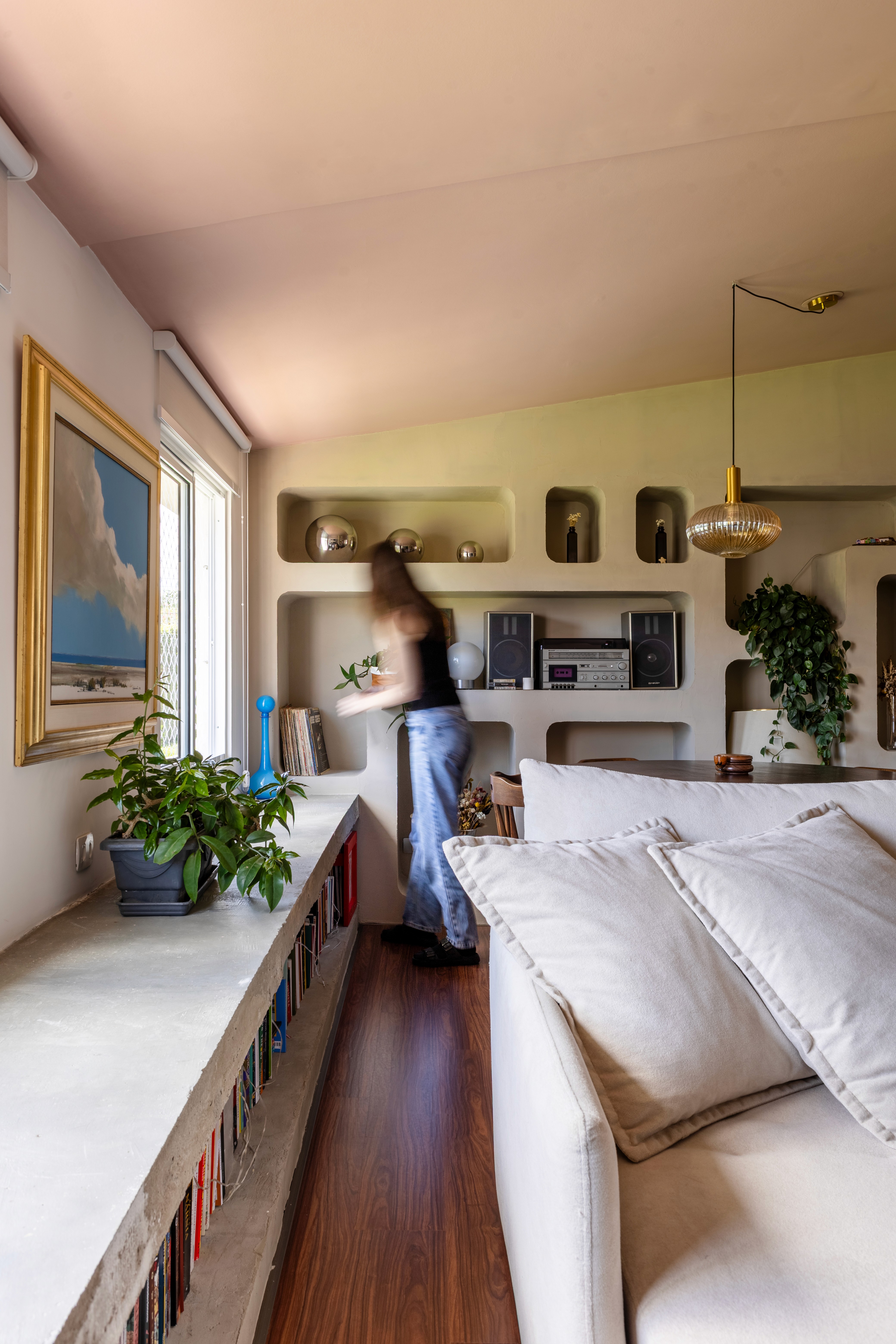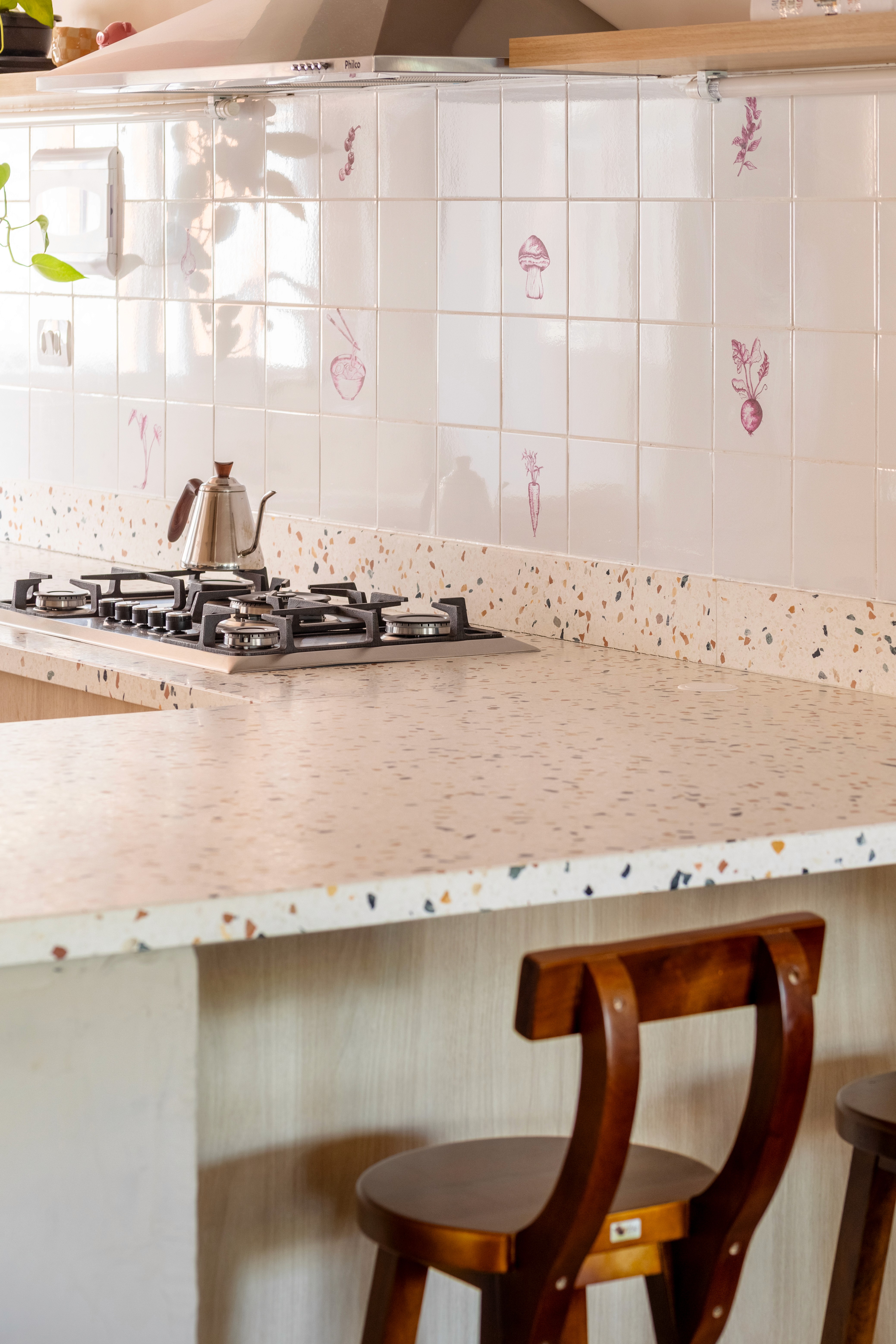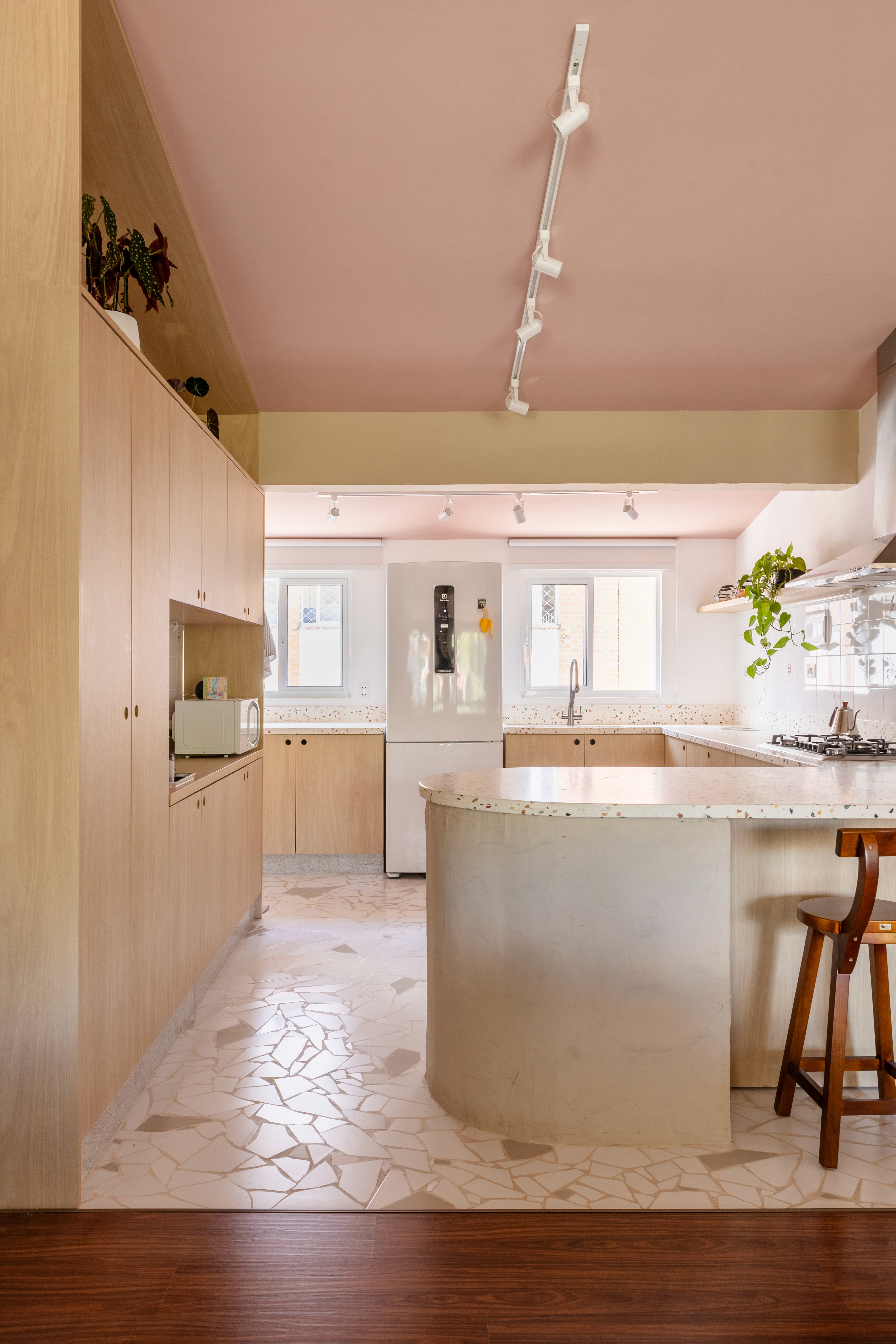 O design de interiores abraça quem entra logo no primeiro olhar. O teto inclinado, uma raridade que a fez se apaixonar pelo imóvel, foi assumido e valorizado. Logo abaixo, uma imponente parede de nichos orgânicos na sala de estar abriga as memórias e a personalidade marcante da moradora. Na cozinha, o revestimento do piso em cacos cerâmicos resgata uma nostalgia elegante com muito cuidado nas texturas, enquanto o toque de exclusividade fica por conta dos azulejos do frontão, ilustrados à mão pela irmã da cliente.