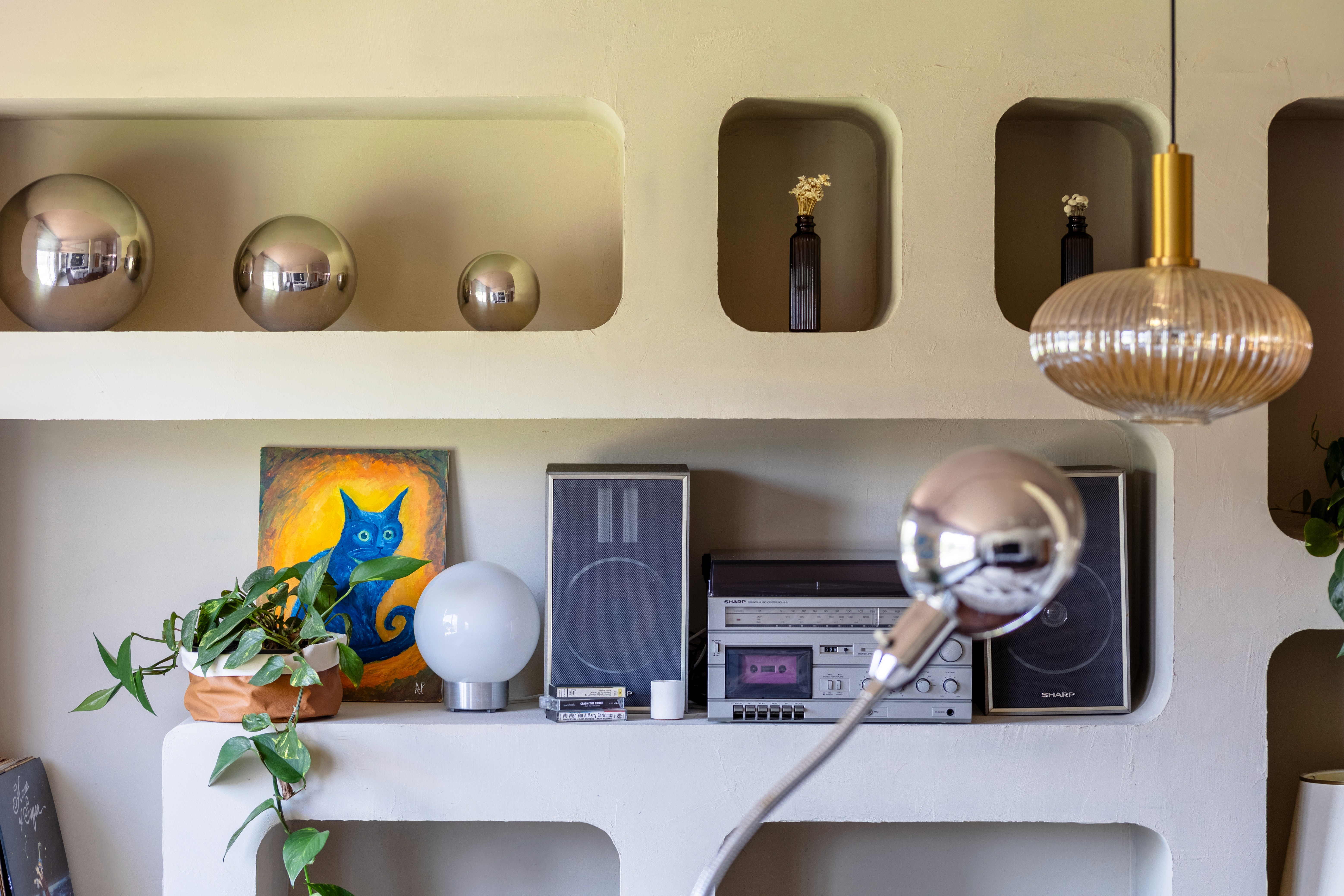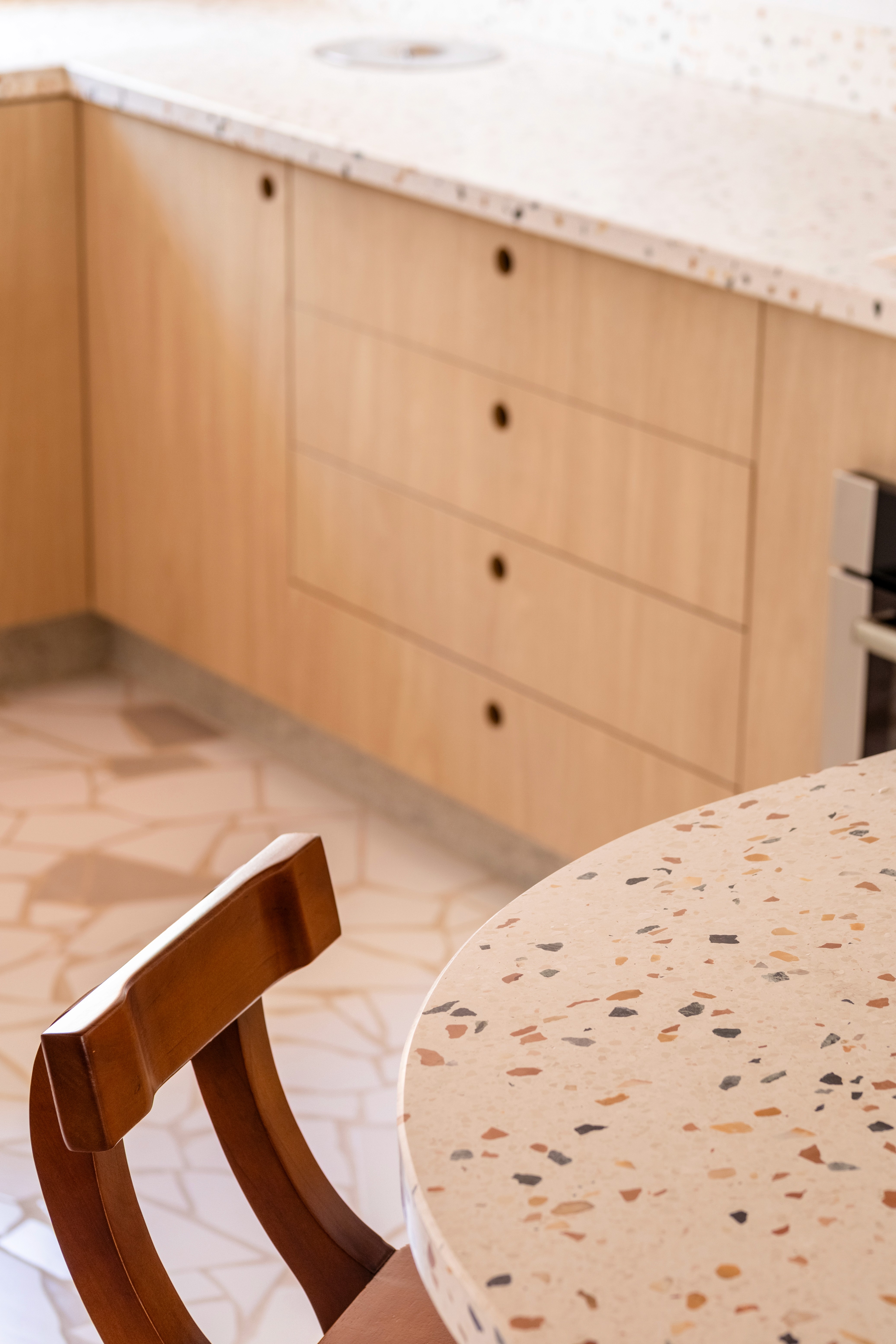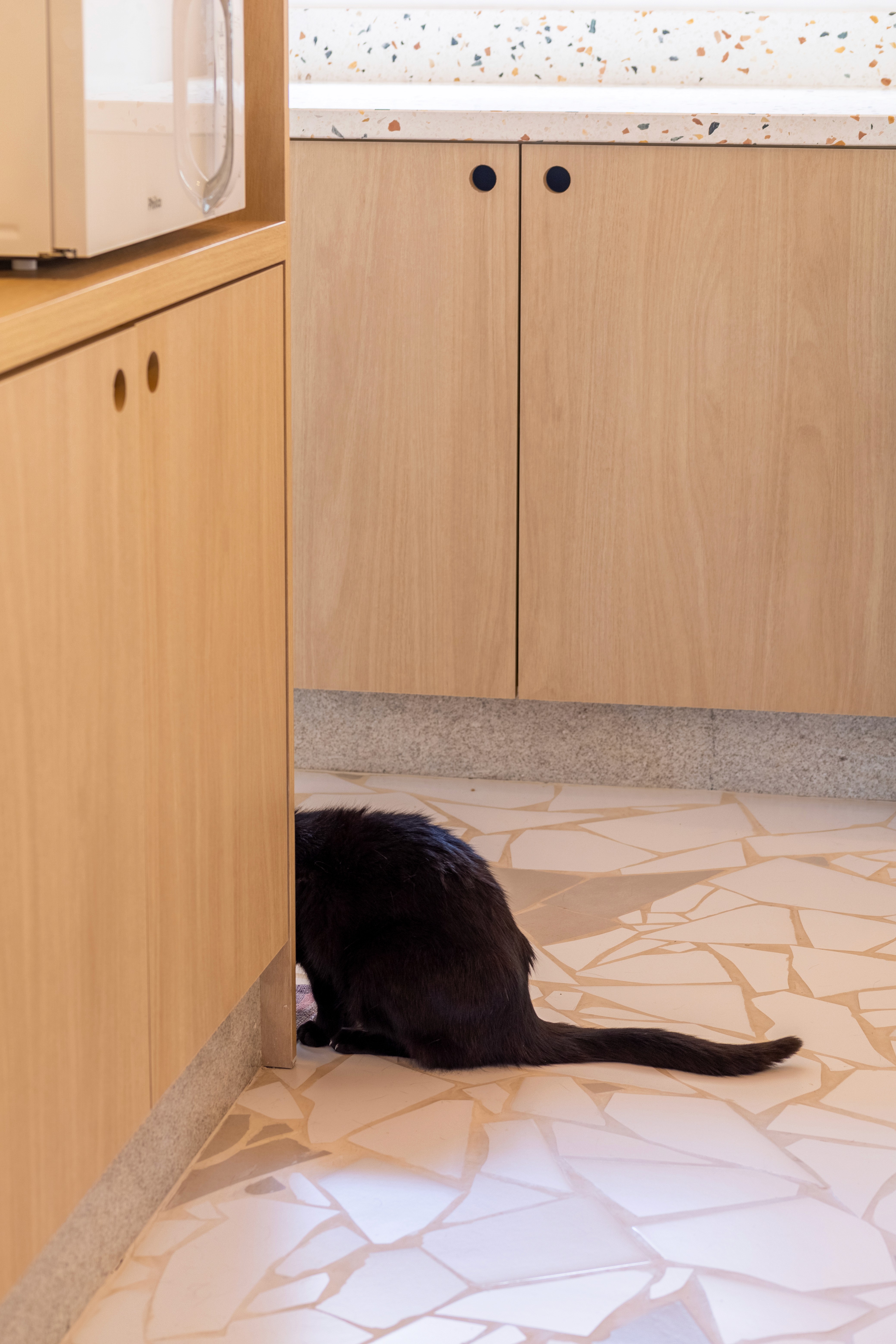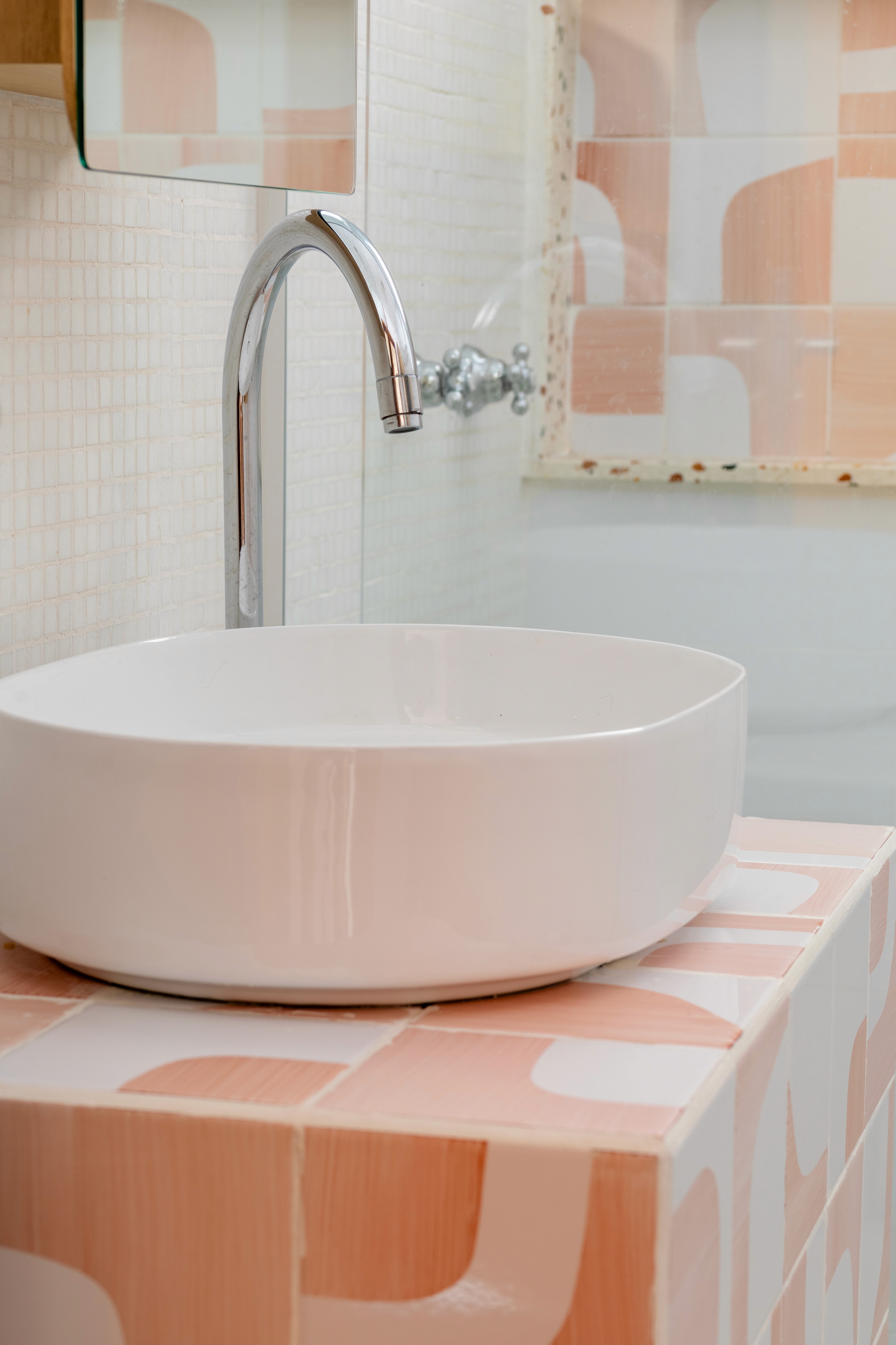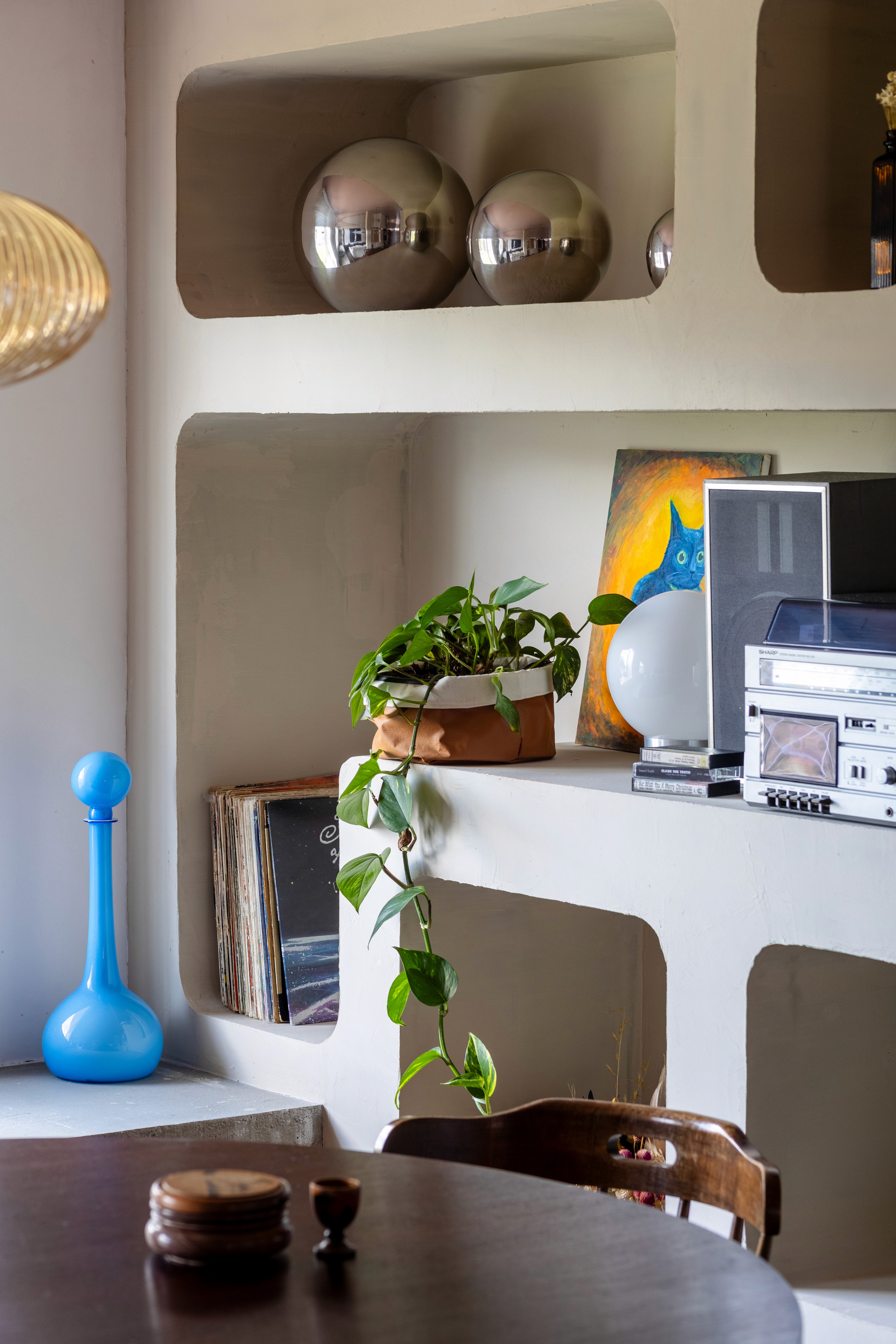 O design de interiores abraça quem entra logo no primeiro olhar. O teto inclinado, uma raridade que a fez se apaixonar pelo imóvel, foi assumido e valorizado. Logo abaixo, uma imponente parede de nichos orgânicos na sala de estar abriga as memórias e a personalidade marcante da moradora. Na cozinha, o revestimento do piso em cacos cerâmicos resgata uma nostalgia elegante com muito cuidado nas texturas, enquanto o toque de exclusividade fica por conta dos azulejos do frontão, ilustrados à mão pela irmã da cliente.