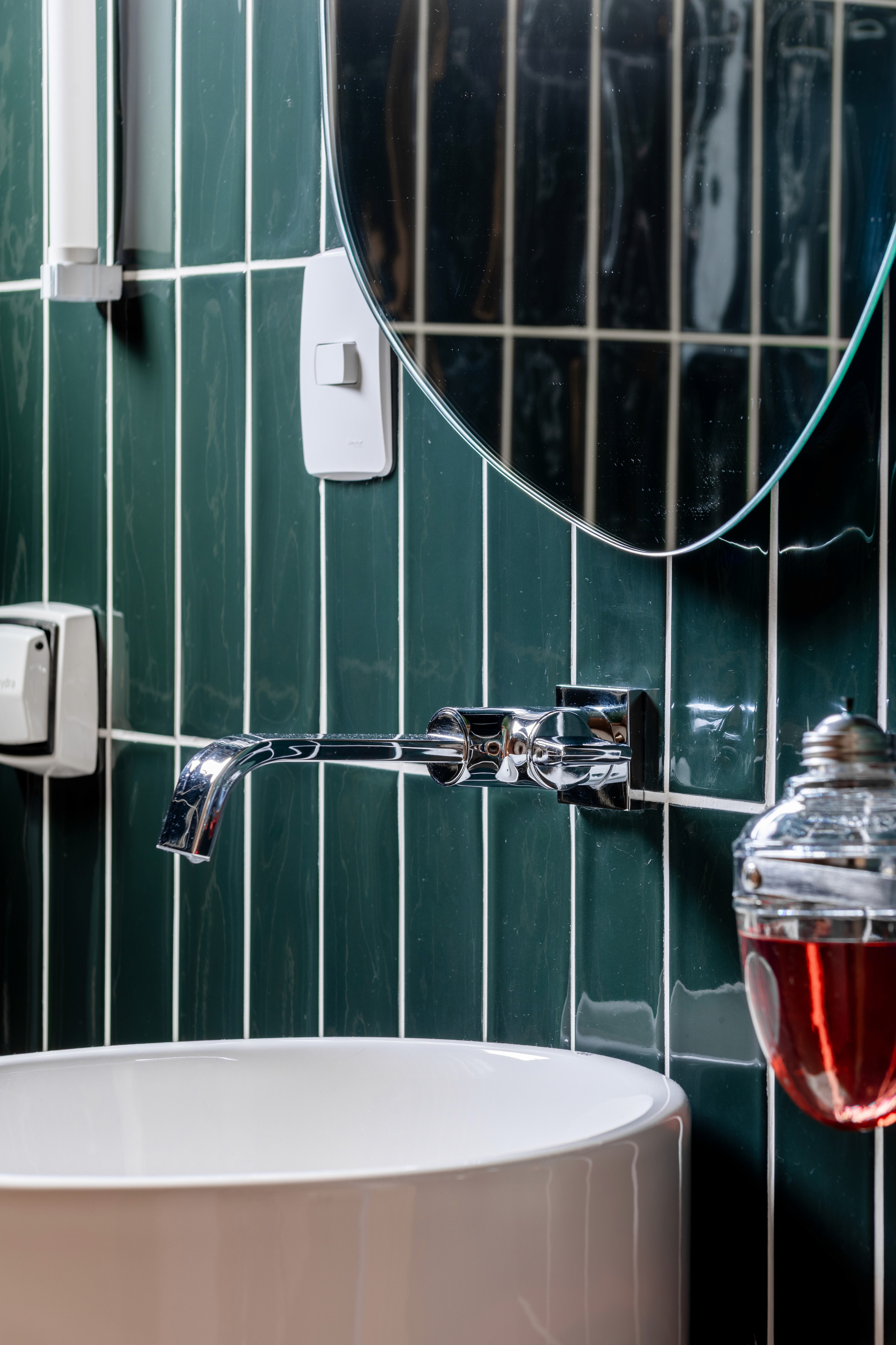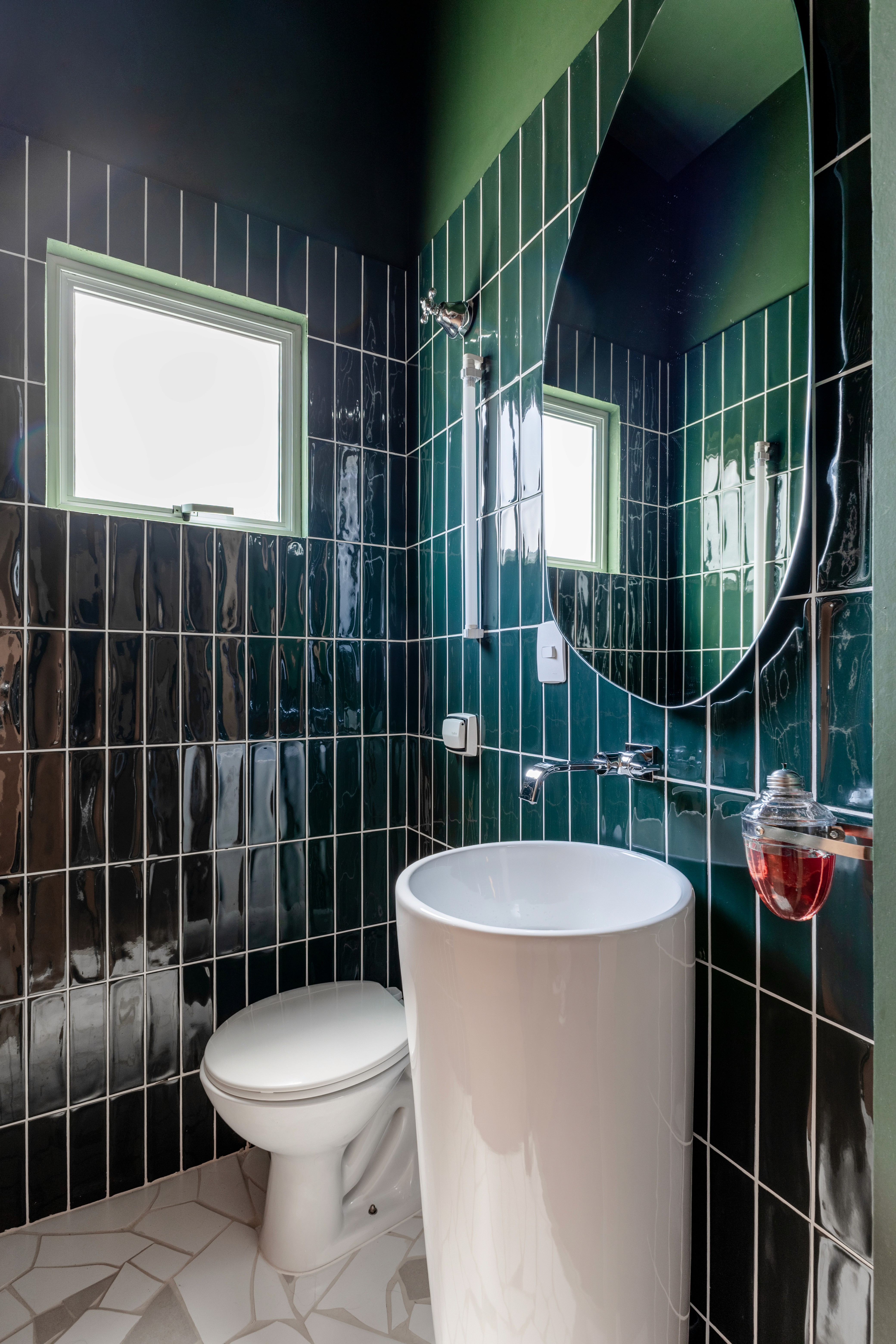 Os banheiros também ganharam identidades únicas e marcam a força do design afetivo. O banheiro íntimo traz a arte do muralista curitibano Rômulo Lass, utilizando azulejos da linha Carbono na cor salmão para revestir a bancada e o nicho. Já o lavabo aposta em um forte impacto visual com revestimentos escuros da linha Gouache da Portobello cobrindo todas as paredes. Para amarrar toda a composição, o projeto luminotécnico foi calculado para criar diferentes atmosferas, priorizando um clima intimista com luz baixa e indireta através de pendentes e abajures.