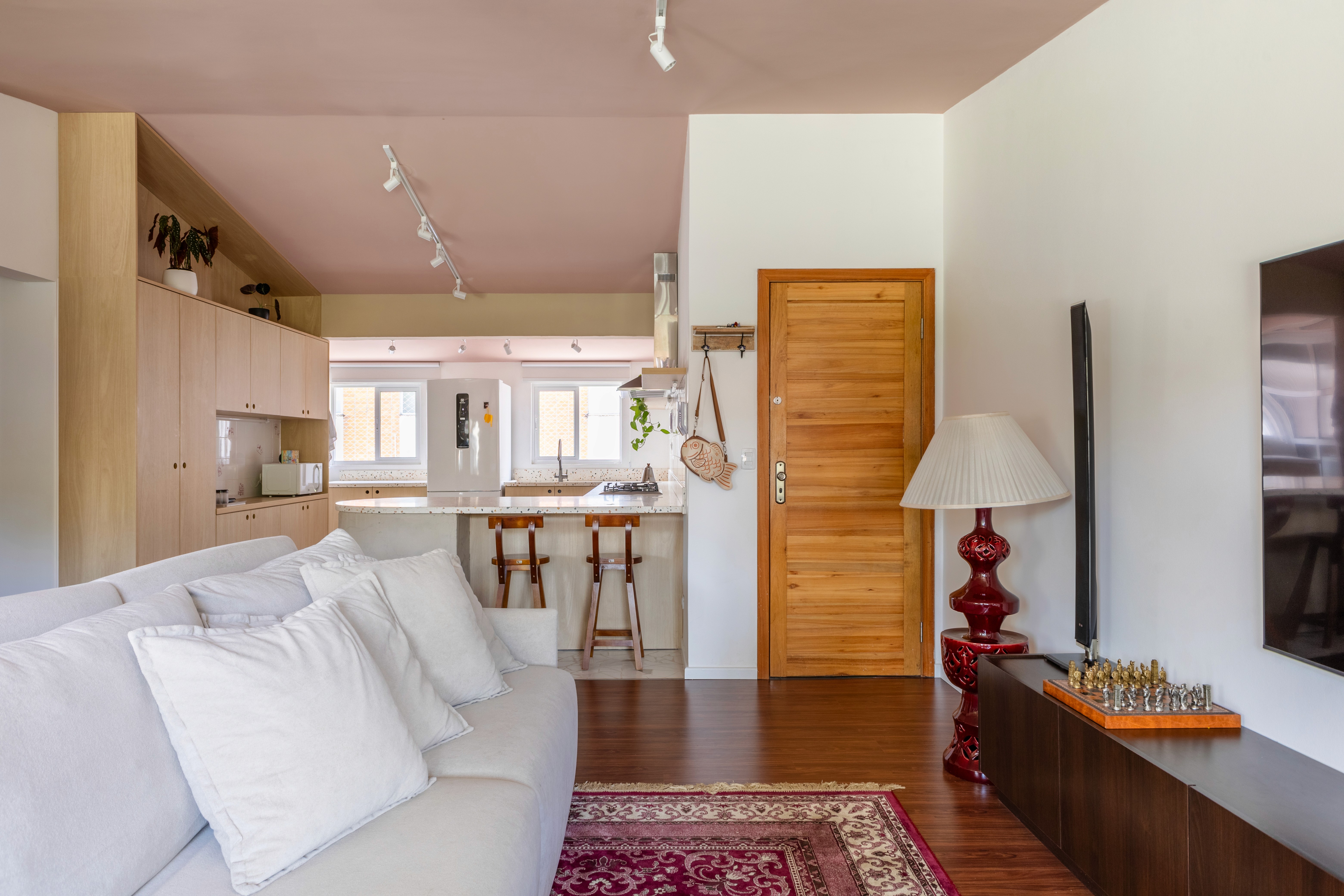 Para transformar este primeiro apartamento em um refúgio sob medida, a planta original dos anos 90 foi totalmente reconfigurada. Na arquitetura do espaço, demolimos um dormitório para ampliar o living e removemos as barreiras da cozinha, criando uma área social completamente integrada, fluida e com excelente ventilação cruzada.